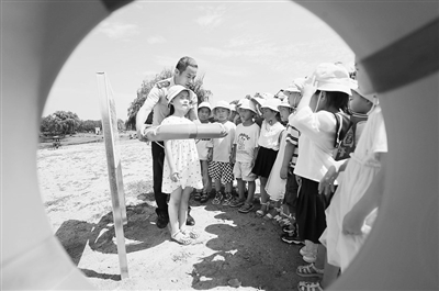图② 为7月2日,山东省临沂市沂南县公安局特巡警大队的民警为界湖街道中心幼儿园的小朋友讲解救生圈的使用方法。 新华社发(王彦冰摄)