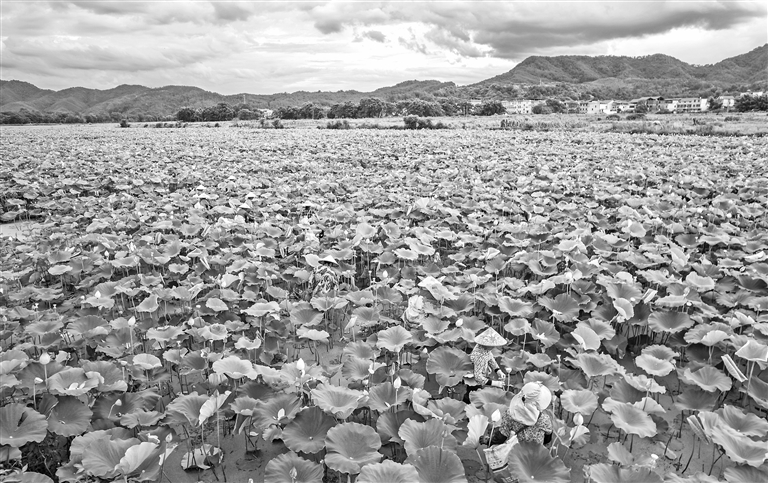 ▲近年来,信丰县大桥镇中塅村依托良好生态环境,大力发展莲子产业,带动村民增收致富。图为6月29日,农户在荷塘里采摘莲蓬。特约通讯员 李 健摄