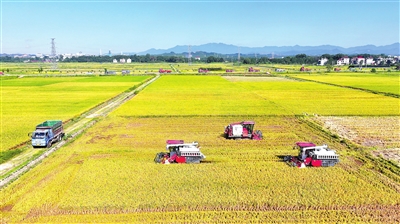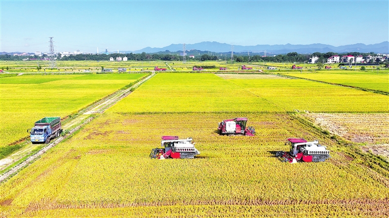 7月3日,永丰县八江乡高家村,示范水库灌区高标准农田一片金黄,农民驾驶收割机在田间来回穿梭收割早稻。通讯员 刘浩军摄
