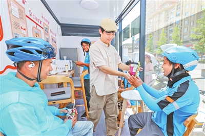 7月2日,在浙江省湖州市德清县总工会设置的工会驿站里,爱心商家为外卖小哥送冷饮。新华社发(姚海翔摄)