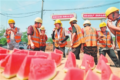 7月3日,在山东省临沂市沂南县铜井镇董梁高速第四标段施工现场,工人们在休息区吃西瓜解暑。