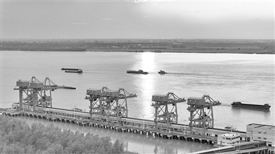 近日,持续高温天气导致用电量剧增,九江市各水运码头和铁路货运站科学调控,确保电煤高效有序运输。图为6月30日,湖口银砂湾园区的一处电煤货运码头,电煤卸船有序进行,一船船电煤经传输带运至发电厂发电。 特约通讯员 朱海鹏摄