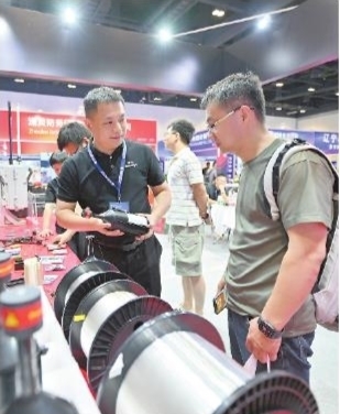 7月5日,2025国际无人机应用及防控大会暨第六届中国国际无人机及无人系统博览会在北京国家会议中心开幕。500余家国内外知名无人机厂商携带最新产品、技术等亮相,其中江西多款产品受到国内外观众青睐。图为观众在九江电目科技有限公司展区了解超轻型光纤传输产品。