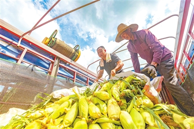 7月1日,庐山市蛟塘镇芙蓉村,当地试种的3000亩新品种玉米喜获丰收,农民将刚刚收获的玉米装上卡车供应市场。