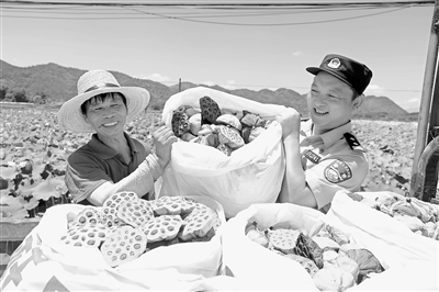 ▲正值采收季,分宜县警方将警务服务延伸到荷塘边,通过巡逻防控、纠纷调解、助农采摘等举措,帮助村民解决实际问题。图为7月2日,该县凤阳镇太空莲种植基地,民警帮助村民采收莲蓬。本报全媒体记者 曹章保摄