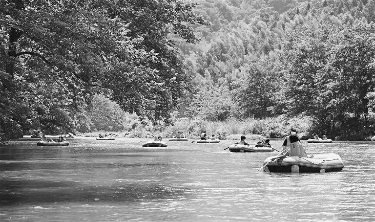 ▲7月5日,靖安县金罗湾漂流区热闹非凡,游客穿梭于青山绿水间,尽享夏日清凉体验。