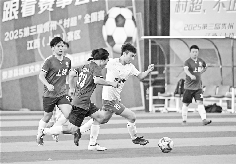 7月5日晚,在婺源县体育中心足球场,“大美上饶 快乐村超”——2025第三届贵州“村超”全国赛江西(上饶)赛区婺源分赛区比赛拉开帷幕,婺源石门村和德兴大茅山、广信一队和广丰挖掘机队4支足球队分别展开现场比拼,吸引众多市民和游客观看。