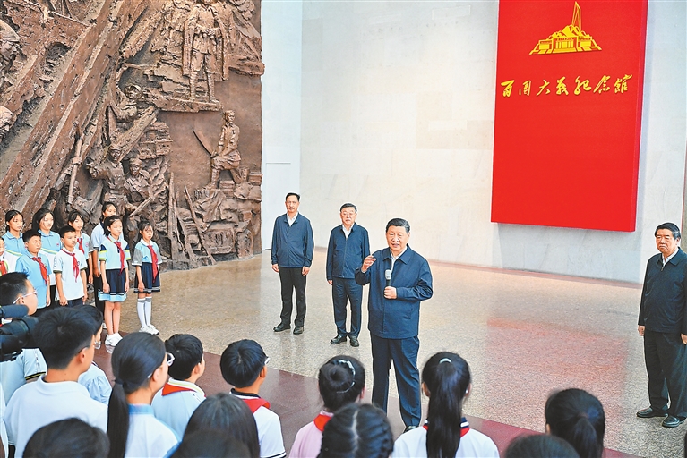 在纪念馆大厅,习近平同前来参观的青少年学生和纪念馆工作人员亲切交流。他说,88年前的今天发生的“七七事变”,是中华民族全面抗击日本侵略者的起点,前事不忘、后事之师,到这里来就是接受精神洗礼。广大青少年生逢其时,要赓续红色血脉,树立强国有我的远大志向,做堂堂正正、光荣自豪的中国人,勇担民族复兴的时代大任。