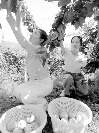 近年来,上栗县通过产业带动乡村振兴,建设多个集采摘、休闲于一体的种植产业综合体。图为7月4日,游客在赤山镇龙溪生态种植基地采摘翠冠梨。本报全媒体记者 刘启红摄