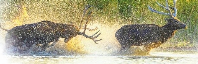 原来,作为一种“亲水”动物,麋鹿极善游泳,一天大部分时间泡在水中,采食水草、树叶等。而每年5月到8月是麋鹿的发情交配期,也是其最为活跃的时段,其间,成年雄鹿常以双角挑举青草藤蔓等植物以示炫耀,并跟随和追逐母鹿。此时,雄鹿之间还会开启一场争夺配偶权的决斗,互相对峙或双角顶撞,即所谓的鹿王之争。