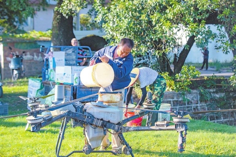 ▶眼下正值制种水稻管护期,横峰县青板乡青板村种植户利用植保无人机开展施肥、喷药等飞防作业,对制种水稻秧苗进行管护。图为7月6日,种植户在进行飞防作业前的准备工作。通讯员 薛 南摄