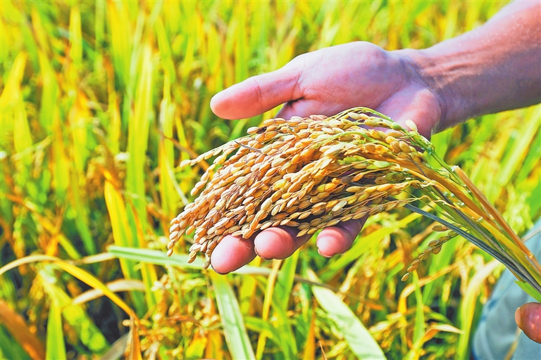 7月7日小暑时节,峡江县的早稻陆续成熟,当地农民抢抓农时收早稻、插晚稻,田间地头一派繁忙景象。图为金坪民族乡南下村的农民在查看水稻稻穗。