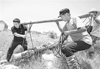连日来,万年县各级干部深入田间地头,科学调度水源,多措并举抗旱。图为7月7日,该县齐埠乡程家垱村村民在安装潜水泵,抽万年河水补给抗旱水源。