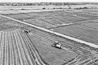▲7月8日,在抚州市东乡区珀玕乡莲塘村,连片的早稻陆续成熟,农民正驾驶农机收割。特约通讯员 饶方其摄