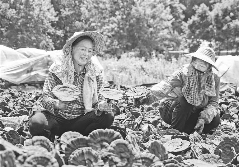 ◀7月4日,会昌县中村乡洋光村灵芝种植基地,村民正忙着采收、晾晒成熟的灵芝。
