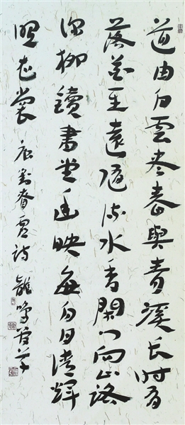 | 汉简条幅 《刘昚虚·阙题》 释文:道由白云尽,春与青溪长。时有落花至,远随流水香。闲门向山路,深柳读书堂。幽映每白日,清辉照衣裳。(简·不简单——郑荣明简牍书法展暨师生书法交流展;广东佛山书法园;7月) 郑荣明书 |