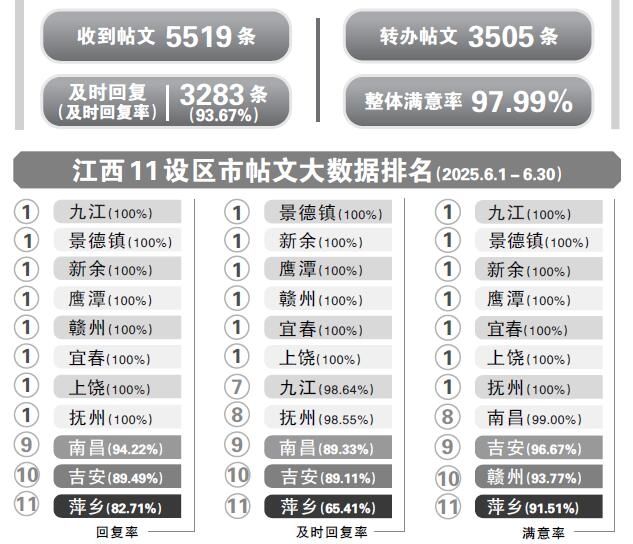 本报讯 (大江网全媒体记者陈志燕、曹智健)7月13日,大江网《问政江西》栏目组2025年6月问政大数据新鲜出炉。数据显示,6月1日至30日,栏目组共收到群众投诉建议帖文5519条,其中3505条帖文证据相对充足、内容详实,已转到各职能部门办理;共收到3377条回复,其中及时回复3283条,及时回复率93.67%,整体满意率97.99%。景德镇、新余、鹰潭、宜春、上饶表现亮眼,及时回复率和满意率均为100%。