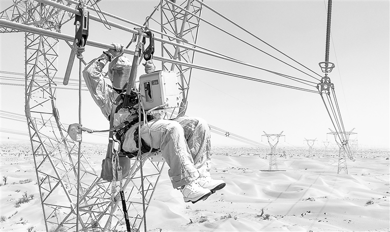 从高空俯瞰,超高压电力环网沿着塔里木盆地,在沙漠边缘、陡峭的山坡上蜿蜒游走,如同舒展的“血管”;近1万座铁塔扎进沙漠戈壁,是撑起整个线路的“骨骼支架”;9座750千伏变电站是跳动的“心脏”,收集风电、光电、火电、水电,调整电压后,再把电送出去。