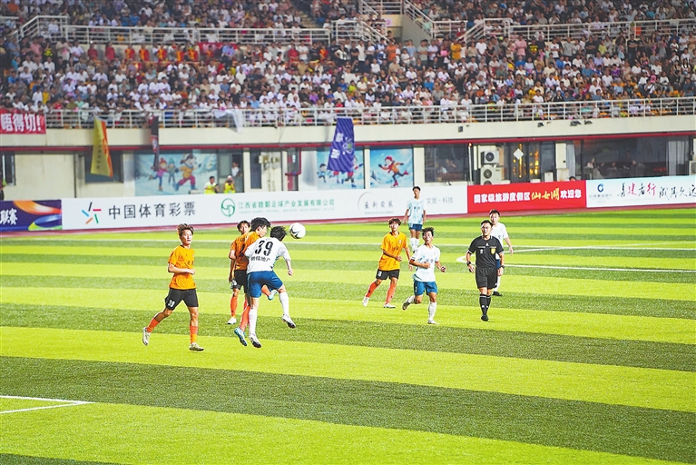 7月13日晚,2025年江西省城市足球超级联赛在新余市体育中心举行,新余队与吉安队激战正酣。本报全媒体记者 邹宇波摄