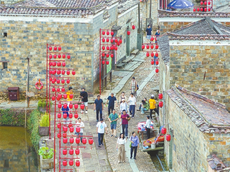 7月9日,游客在中国历史文化名村金溪县双塘镇竹桥村旅游观光。
