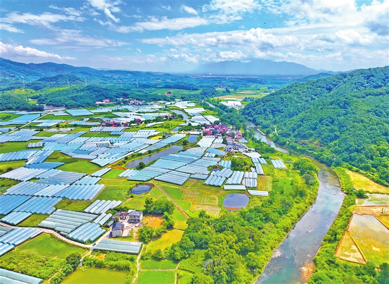 7月10日,德安县聂桥镇宝山村,一个个设施农业大棚鳞次栉比,成为当地村民发展产业助增收的“钱袋子”。特约通讯员 朱海鹏摄