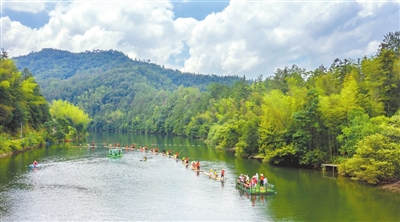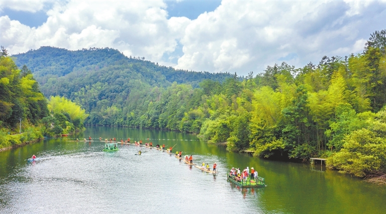 7月11日,铜鼓县港口乡赤洲村碧湾海景区举办首届放排节暨乡村文旅活动。游客乘坐竹排,亲近山水。本报全媒体记者 梁振堂摄