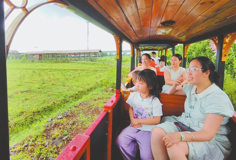 7月12日,在抚州市东乡区邓家乡玫瑰小镇里,游客乘坐观光小火车感受乡村气息。