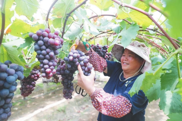 同样,不远处的小桥村吴家自然村葡萄种植基地也是一派忙碌的丰收景象。在基地负责人闵风根的指挥下,工人正忙着将一串串成熟的葡萄仔细分拣、打包、装箱。“进入采摘期,每天都忙得不可开交。”闵风根是金桥乡有名的葡萄种植大户,他种植了300余亩葡萄,葡萄品种丰富。“按照亩产2500至3000斤计算,葡萄园能产葡萄约100万斤,刨去种植和人工成本,如果市场价格稳定,今年预计能创收600万元左右。”闵风根脸上满是丰收的喜悦。