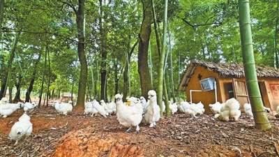 7月10日,记者走进汪陂村,草地上,纯白乌鸡或悠闲踱步,或低头觅食。生人靠近,胆小的躲进林间错落安置的“小别墅”,探头张望。
