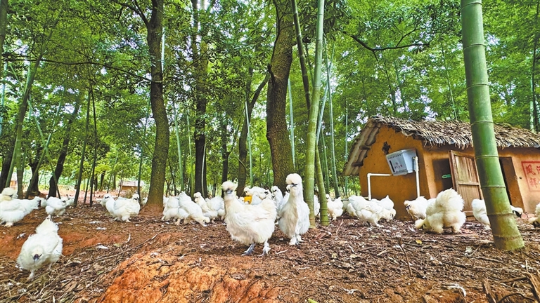 养殖大户刘勤巧对此深有体会。早年他在异地经营餐馆时,168元一份的泰和乌鸡汤供不应求,食客反馈:“味道好,若年份足,则更佳。”这句话触动了他。2021年,他返回汪陂村,联合合作社投身乌鸡养殖,如今承包600多亩山林,建成6个基地,存栏量6万羽,多为“年份鸡”。“林下低密度养殖,生长周期1至4年不等,单只价格从百余元至八百多元。”短短数年,年销售额已达数百万元。