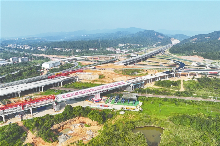 南昌西二绕城高速昌北枢纽是串联东外环、昌九高速的八向互通核心,项目预计9月底全线贯通。图为7月15日,昌北枢纽A匝道重达1.4万吨的转体桥,完成45度转体,平稳跨越京九铁路营业线。本报全媒体记者 洪子波摄