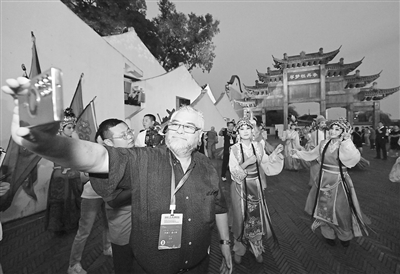 7月16日,外媒嘉宾在抚州文昌里历史文化街区与实景演出《寻梦牡丹亭》演员互动。