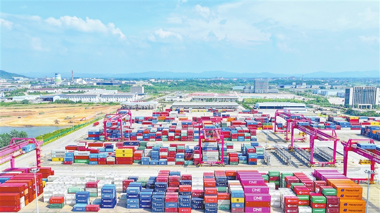 近日,位于彭泽县的九江红光国际港红光码头,集装箱层层码放,装卸作业有序进行。 特约通讯员 朱海鹏摄
