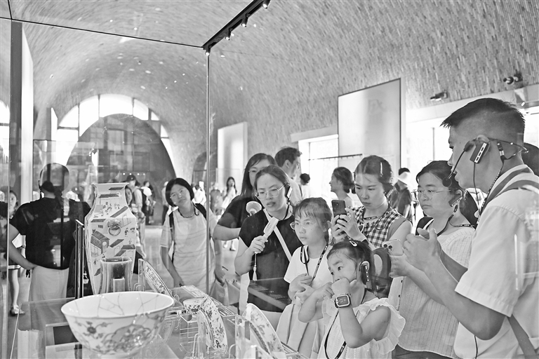 正值暑期,不少家长带孩子来到博物馆游览参观。图为7月13日,在景德镇御窑博物馆内,游客正在欣赏瓷器展品。