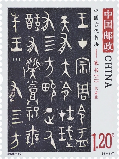 邮票第一枚“大盂鼎”(图1),因作器者为西周康王之臣盂而得名,与毛公鼎、大克鼎在晚清时期一同出土,并称为“海内三宝”。从书法艺术的角度看,大盂鼎笔画丰腴挺拔、浑厚庄重,堪称西周早期金文书法的杰出典范,向来为世人所瞩目。