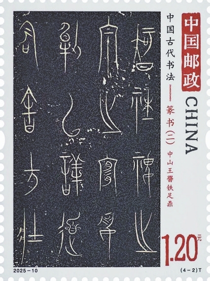 邮票第二枚“中山王舋铁足鼎”(图2),鼎外壁刻满了77行铭文,共计469个字,是目前发现的铭文最长的战国青铜器。其铭文绮丽多姿、典雅飘逸,是战国晚期金文书法艺术的代表作品,所呈现的悬针篆风格,更是它独特的艺术魅力。