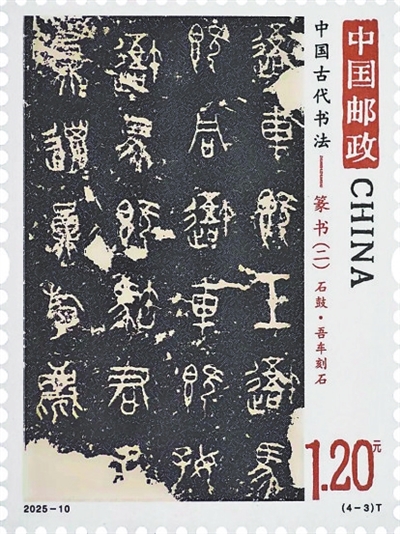 邮票第三枚“石鼓·吾车刻石”(图3)。该刻石为战国时期的重要文物。石鼓是形似圆鼓的一组花岗岩刻石,秦人曾在十面鼓形巨石上刻下10首四言诗,记述君主的游猎盛景,“吾车”为其中一面。石鼓文作为“石刻之祖”,具有大篆向小篆过渡的笔意。其对书法史的发展产生了深远影响,被历代书家奉为临习篆书的重要范本。