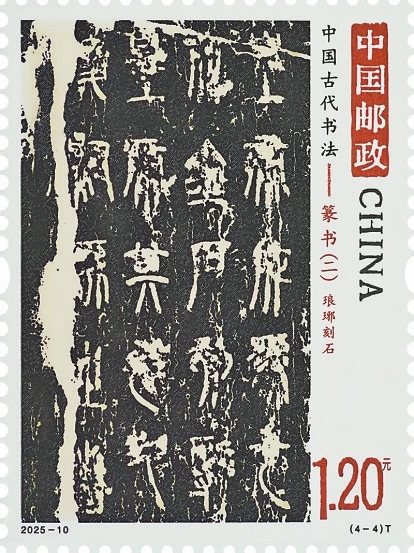 邮票第四枚“琅琊刻石”(图4)。该刻石是刊刻于秦代的一处摩崖刻石——李斯小篆,也为秦朝统一全国文字的典范之作。石刻中刻有秦始皇颂词的部分已荡然无存,虽仅存秦二世诏书部分,仍可窥见“书同文”的历史印记。从书法角度来看,其笔画接近石鼓文,用笔浑厚之中尽显秀丽之美。