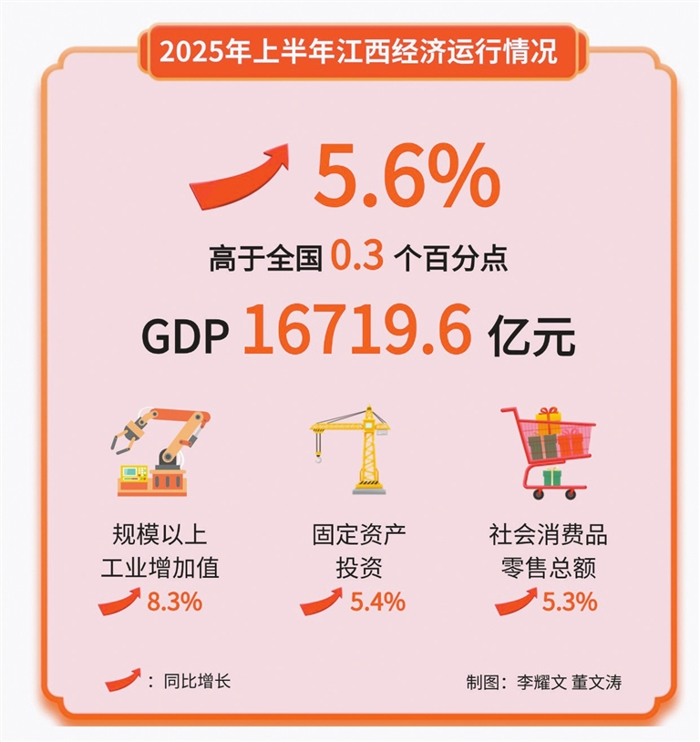 本报讯 (全媒体记者李耀文、董文涛)7月18日,省统计局、国家统计局江西调查总队联合发布2025年上半年江西经济运行情况:根据地区生产总值统一核算结果,上半年全省地区生产总值16719.6亿元,按不变价格计算,同比增长5.6%,高于全国0.3个百分点,保持了5.5%以上的较快增速。全省经济运行平稳向好、顺利实现“双过半”。