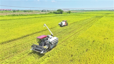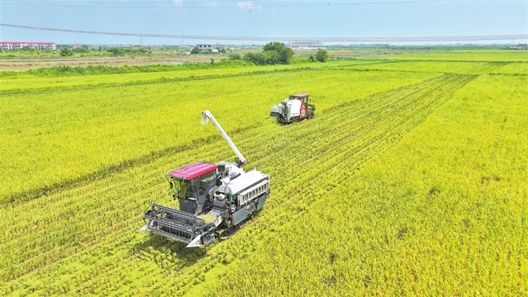 7月15日,在位于南昌市新建区的江西鄱谷农业科技有限公司高标准农田内,农机手正驾驶联合收割机收割早稻。本报全媒体记者 王蕴蓉摄