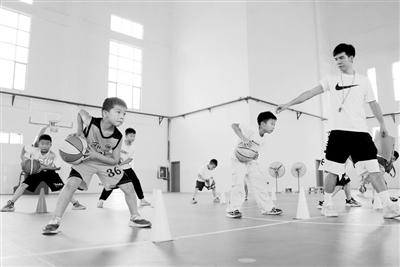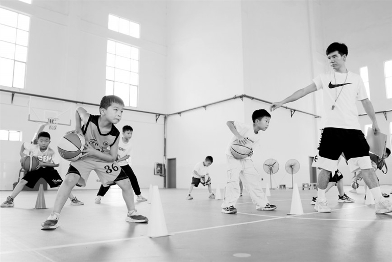 7月16日,上高县锦阳小学的孩子们在老师的指导下练习篮球基本功。特约通讯员 陈旗海摄