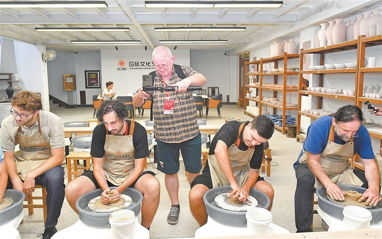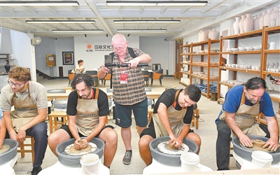 | 7月16日,在景德镇市昌南新区名坊园,外媒嘉宾亲自上手体验陶瓷制作。本报全媒体记者 王 祺摄 |
