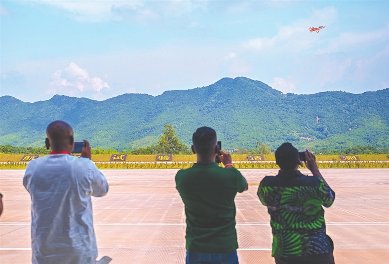 | 7月16日,外媒嘉宾在位于赣州市南康区的中国赣州低空经济产业园观看无人机表演。本报全媒体记者 张翰林摄 |