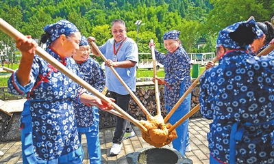 | 7月17日,在上犹县梅水乡园村村,外媒嘉宾体验黄元米果的制作工艺。本报全媒体记者 张翰林摄 |