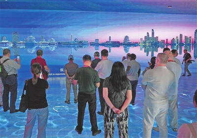 | 7月15日,九江市国土空间规划馆,外媒嘉宾正在观看九江市宣传片。张玉丰摄 |