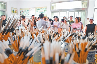 | 7月8日,采访团成员走进进贤县文港镇,探访该镇做大做强毛笔产业、形成独具特色区域品牌的奥秘。 |