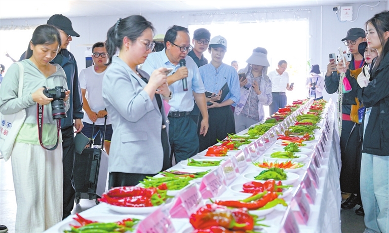 | 7月7日,采访团成员被高安市上湖乡富硒辣椒产业园的上百种辣椒吸引,纷纷拿起手机拍摄。 |