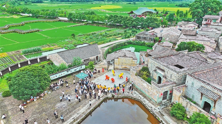 | 7月9日,金溪县竹桥村的“手摇狮”表演,吸引采访团成员和游客驻足观看。 |