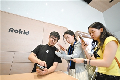 | 7月10日,在位于鹰潭市余江区眼镜产业园的灵伴科技有限公司(Rokid)产品展示厅内,公司创始人祝铭明(左)戴着AR眼镜向采访团成员演示产品功能。 |