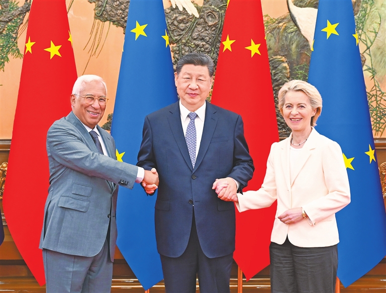 三是践行多边主义,维护国际规则秩序。面对战争与和平、竞争与合作、封闭与开放的重大选择,多边主义、团结合作才是正确答案。中欧要共同维护第二次世界大战结束后建立起来的国际规则和国际秩序,与时俱进推动构建更加公正合理的全球治理体系,携手应对气候变化等全球性挑战,让多边主义的火炬照亮人类前行之路。中欧要支持通过政治手段和平解决国际争端。中方一贯从事情本身的是非曲直出发,主张劝和促谈,倡导标本兼治。中方愿同欧方加强协调,推动今年联合国气候变化贝伦大会取得成功,为应对气候变化和全球绿色转型作出更大贡献。中方也愿同欧方开展人工智能领域政策沟通和务实合作,共同推动平等有序的世界多极化、普惠包容的经济全球化。